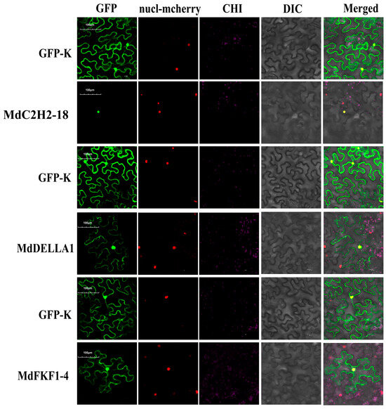 The sequences of MdC2H2-18, MdDELLA1, and MdFKF1-4 were constructed on the pGBKT7 vector to obtain the MdC2H2-18-GFP, MdDELLA1-GFP, and MdFKF1-4-GFP fusion proteins, respectively. Tobacco leaves were injected at 4 weeks of age, and fluorescence was observed 48 h later. Imaging was performed using an FV3000 confocal laser scanning microscope (Olympus, Japan In Olympus Corporation Global Headquarters 2951 Ishikawa-machi, Hachioji-shi, Tokyo 192-8507, Japan).