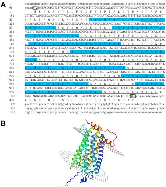 Bioinformatics analysis of P. leopardus sws2. (A) The start codons (ATG) and stop codons (TGA) are boxed and bolded; the red underlined sequences are the 7TM GPCR srsx domain and the blue shadow identifies the transmembrane sequence. (B) Homology-based 3D model of Sws2.