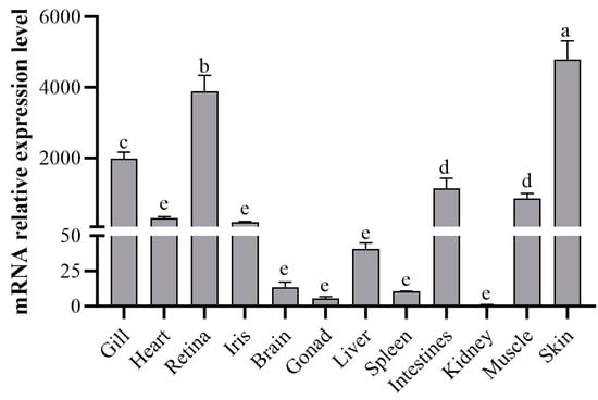 The expression levels of sws2 in the different tissues of P. leopardus were determined using qPCR. As shown in Figure 3, sws2 mRNA was widely distributed and found in all tissues of P. leopardus. Sws2 mRNA was most abundant in the skin (p < 0.05), followed by the retina and gill, and the lowest expression was in the kidney and gonad (p < 0.05, Figure 3).