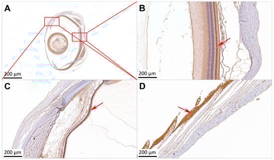 Immunohistochemical localization of Sws2 in P. leopardus eye and skin tissues. Brown coloration means positive signals. (A): The overall paraffin section of the P. leopardus eye. Sws2 was localized in the iris (C) and retina (B) of the eye, and epidermal cells of the skin (D). The red arrow means positive signal.