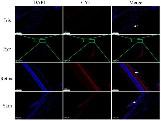 In situ hybridization of the sws2 gene in the eye and skin of P. leopardus. The white arrow means positive signal.