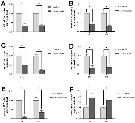 As shown in Figure 6, the sws2 expression levels significantly decreased after 24 and 48 h of sws2 interference (p < 0.05), this coincided with notable alterations in the expression levels of genes involved in melanin and carotenoid biosynthesis in the skin of P. leopardus. The expression levels of mc1r, tyr, tyrp1, and pomc significantly decreased (p < 0.05) and scarb1 significantly increased (p < 0.05) under sws2 interference.