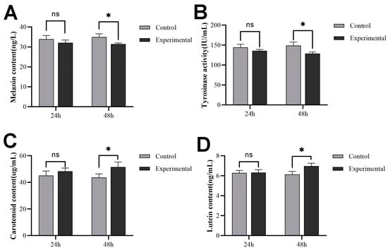 The pigment content and tyrosinase activity in fish skin changed significantly at 48 h after sws2 knockdown. As depicted in Figure 7, the melanin content in the skin showed no significant alteration at 24 h, but decreased significantly at 48 h (Figure 7A, p < 0.05). The trends in tyrosinase activity mirrored those of the melanin content (Figure 7B). In addition, the carotenoid and lutein contents in the skin both had no significant change at 24 h, then significantly increased after sws2 knockdown (p < 0.05) (Figure 7C,D), with a greater increase in the carotenoid content.