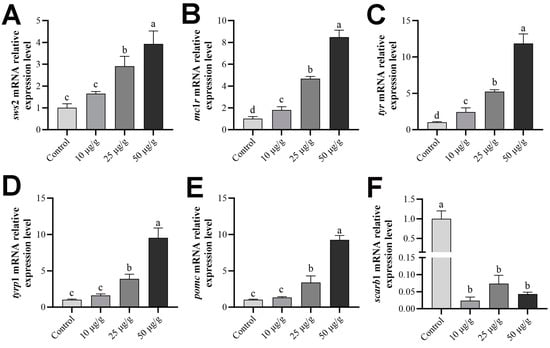 Expression levels of sws2 (A), mc1r (B), tyr (C), tyrp1 (D), pomc (E), and scarb1 (F) in the skin of P. leopardus after retinoic acid treatment. Significant differences among the means of experimental groups are denoted by distinct lowercase letters (p < 0.05).