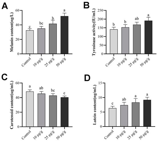 Pigment content and tyrosinase activity in the skin of P. leopardus after retinoic acid treatment. (A) Melanin content after retinoic acid treatment; (B) tyrosinase activity after retinoic acid treatment; (C) carotenoid content after retinoic acid treatment; (D) lutein content after retinoic acid treatment. Significant differences among the means of experimental groups are denoted by distinct lowercase letters (p < 0.05).