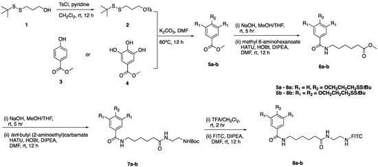 3.2.4. Synthesis of Methyl 6-(4-(3-(Tert-butyldisulfaneyl)propoxy)benzamido) Hexanoate (6a)
