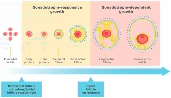 - Candelaria, J.I.; Rabaglino, M.B.; Denicol, A.C. Ovarian preantral follicles are responsive to FSH as early as the primary stage of development. J. Endocrinol. 2020, 247, 153–168. [Google Scholar] [CrossRef] [PubMed]