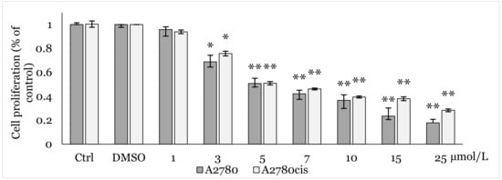 Antiproliferative effect of 1C on A2780 and A2780cis cells after 48 h exposure determined by MTT assay. Results show mean ± standard deviation calculated from three independent experiments. Statistical significance: * p < 0.05, ** p < 0.01 vs. control (DMSO).