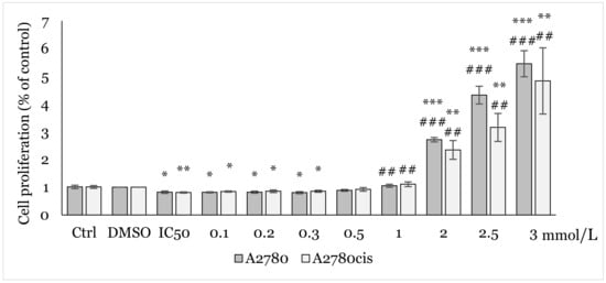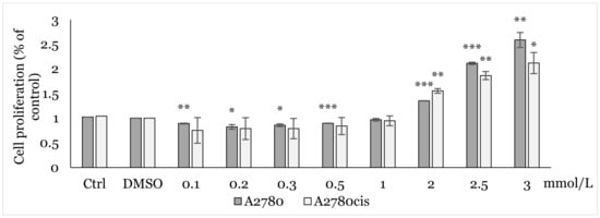 Effect of NAC on A2780 and A2780cis cells after 48 h exposure determined by MTT assay. Results show the mean ± standard deviation calculated from three independent experiments. Statistical significance: * p < 0.05, ** p < 0.01, *** p < 0.001 vs. control (culture medium).