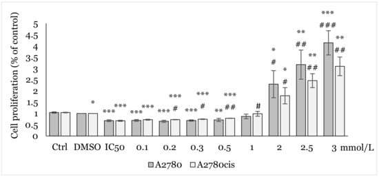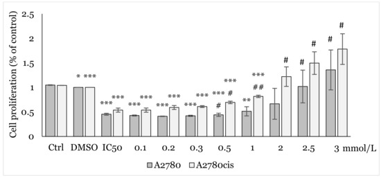 The MTT colorimetric assay, performed to analyze the antiproliferative effect of 1C, showed a concentration-dependent cytotoxic effect with significant inhibition of cell viability at several concentrations starting from 3 μmol/L in both cell lines. Based on data obtained after 48 h exposure, the IC50 value was determined to be 6.59 ± 0.57 μmol/L in A2780 and 6.98 ± 1.12 μmol/L A2780cis cells. After additional testing, concentrations of 9 μmol/L and 7 μmol/L were used for the following experiments in A2780 and A2780cis cells respectively (Figure 1). The selectivity index against the non-tumor cells was not determined. It was previously determined to be 5.54 and 5.23 on the MCF-10A cells, with corresponding IC50 values of 36.54 ± 0.87 μmol/L by Gazdová, 2022 [40].