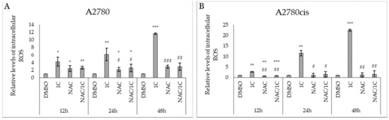 The influence of 1C, NAC, and their combination on ROS production in A2780 (A) and A2780cis (B) cells after 12, 24, and 48 h exposure. Data were obtained from three independent acquisitions. Statistical significance: * p < 0.05, ** p < 0.01, *** p < 0.001 vs. control (DMSO); # p < 0.05, ## p < 0.01, ### p < 0.001 vs. 1C.