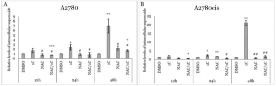 Effect on superoxide anion production in A2780 (A) and A2780cis (B) cells after 12, 24, and 48 h exposure to 1C, NAC, and combination NAC/1C. Presented data were obtained from three independent acquisitions. Statistical significance: * p < 0.05, ** p < 0.01, *** p < 0.001 vs. control (DMSO); # p < 0.05, ## p < 0.01 vs. 1C.