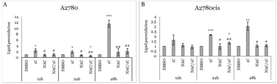 Impact of 1C, NAC, and their combination on lipid peroxidation in A2780 (A) and A2780cis (B) cells treated for 12, 24, and 48 h. Presented data were obtained from three independent acquisitions. Statistical significance: * p < 0.05, ** p < 0.01, *** p < 0.001 vs. control (DMSO); # p < 0.05, ## p < 0.01 vs. 1C.