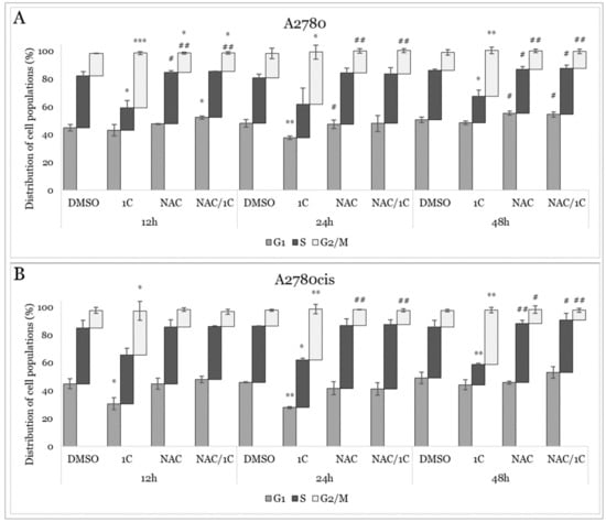 Analysis of cell cycle of A2780 (A) and A2780cis (B) cells affected by 12, 24, and 48 h lasting treatment with 1C, NAC and NAC/1C. Presented data were obtained from three independent acquisitions. Statistical significance: * p < 0.05, ** p < 0.01, *** p < 0.001 vs. control (DMSO); # p < 0.05, ## p < 0.01 vs. 1C.