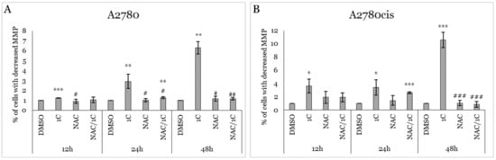 Effect of 1C, NAC, and their combination on the loss of mitochondrial membrane potential in A2780 (A) and A2780cis (B) cells after 12, 24, and 48 h exposure. Presented data were obtained from three independent acquisitions. Statistical significance: * p < 0.05, ** p < 0.01, *** p < 0.001 vs. control (DMSO); # p < 0.05, ## p < 0.01, ### p < 0.001 vs. 1C.