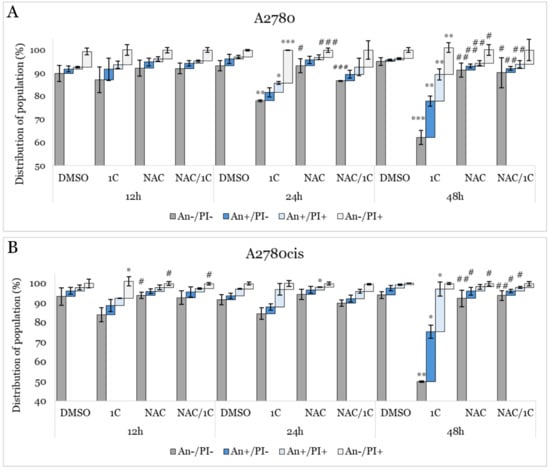 An/PI staining cytometric analysis of apoptosis influenced by 1C, NAC, and their combination in A2780 (upper (A)) and A2780cis (lower (B)) cells after 12, 24, and 48 h incubation. Presented data were obtained from three independent acquisitions. Statistical significance: * p < 0.05, ** p < 0.01, *** p < 0.001 vs. control (DMSO); # p < 0.05, ## p < 0.01, ### p < 0.001 vs. 1C.