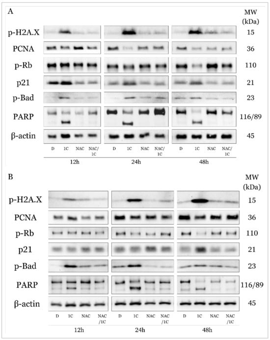 PCNA (Proliferating cell nuclear antigen), which is also considered a marker of proliferation, plays a complex role in the process of repairing damaged DNA and its replication, proliferation, and transition of cells through the entire cell cycle. In A2780 cells, we observed a decrease in PCNA levels after only 12 h, and NAC had only 24 h of incubation in combination with changes in the expression of this protein (Figure 12A). In A2780cis cells, there was an increase in PCNA expression in cells exposed to 1C after 12 h; after 24 and 48 h, this effect was significantly reversed, and after 48 h NAC increased PCNA expression compared to 1C alone (Figure 12B and Figure 14B).