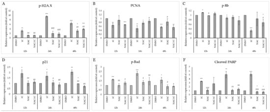 Among the most important tumor suppressors is the protein p21 Waf1/Cip1, which is considered a promiscuous inhibitor of all cyclin complexes and cyclin-dependent kinases and is capable of binding and inhibiting PCNA, thereby significantly contributing to stopping cell cycle progression. Our results showed that p21 was significantly upregulated in A2780 and A2780cis cells at all exposure times (from 12 to 48h), but NAC was able to suppress this effect and p21 levels were at the control level in the cisplatin-sensitive line at 24h, in A2780cis already after 12 h in cells incubated with NAC and subsequently 1C (Figure 12A,B, Figure 13D and Figure 14D).