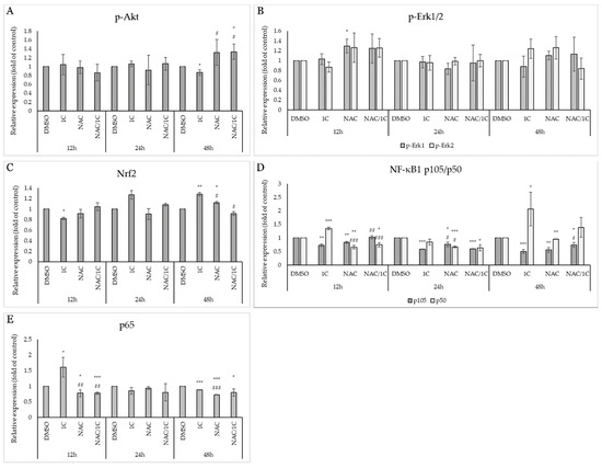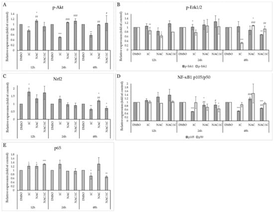 Densitometric analysis of phosphorylation of Akt (A), phospho-Erk1/2 (B), Nrf2 (C), NF-κB1 105/p50 (D), and p65 (E) after 12, 24 and 48, and 72 h of 1C treatment in A2780cis cells. Presented data were obtained from three independent acquisitions. Statistical significance: * p < 0.05, ** p < 0.01, *** p < 0.001 vs. control (DMSO); # p < 0.05, ## p < 0.01, ### p < 0.001 vs. 1C.