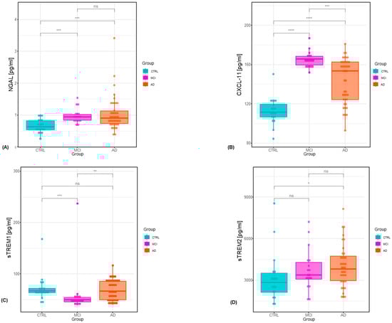 (A) Cerebrospinal fluid neutrophil gelatinase-associated lipocalin concentrations by group. (B) Cerebrospinal fluid CXCL-11 concentrations by group. (C) Cerebrospinal fluid soluble triggering receptor expressed on myeloid cells-1 concentrations by group. (D) Cerebrospinal fluid soluble triggering receptor expressed on myeloid cells-2 concentrations by group; CTRL—control; MCI—mild cognitive impairment; AD—Alzheimer’s disease. **** p < 0.0001, *** p < 0.001, ** p < 0.01, * p < 0.05, ns—not significant.
