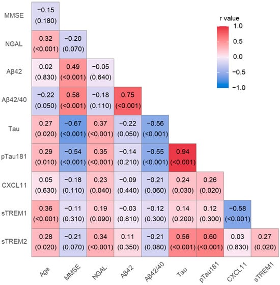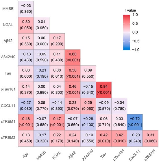 In the MCI group, no significant correlations with NGAL or other proteins were observed. However, there was a strong, significant correlation between sTREM2 and tau (R = 0.71, p < 0.001) and pTau (R = 0.77, p < 0.001) (Figure S1 in Supplementary Materials).