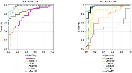 Comparison of area under ROC curves (AUC) for cerebrospinal fluid levels of pro and anti-inflammatory and classical AD biomarkers in AD and CTRL groups. NGAL—neutrophil gelatinase-associated lipocalin; sTREM1—soluble triggering receptor expressed on myeloid cells-1; sTREM2—soluble triggering receptor expressed on myeloid cells-2. AD—Alzheimer’s disease; CTRL—control.
