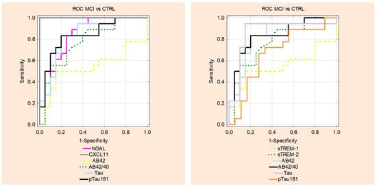 Comparison of area under ROC curves (AUC) for cerebrospinal fluid levels of pro and anti-inflammatory and classical AD biomarkers in MCI and CTRL groups. NGAL—neutrophil gelatinase-associated lipocalin; sTREM1—soluble triggering receptor expressed on myeloid cells-1; sTREM2—soluble triggering receptor expressed on myeloid cells-2; MCI—mild cognitive impairment; CTRL—control.