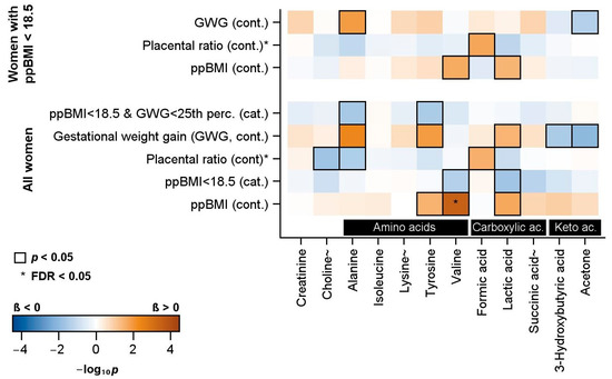 Figure 2 presents the association of maternal and neonatal parameters with plasma metabolites measured in neonatal cord blood. Decreasing continuous ppBMI is associated with decreasing values of tyrosine, valine, and lactic acid. Valine and lactic acid concentrations were also lower when ppBMI was dichotomized at 18.5 kg/m2. Increasing placenta-to-birth-weight ratios were associated with decreasing choline and alanine, as well as increasing formic acid. Increasing GWG was associated with increasing alanine, tyrosine, and lactic acid concentrations. GWG was negatively associated with 3-hydroxybutyric acid and acetone.
