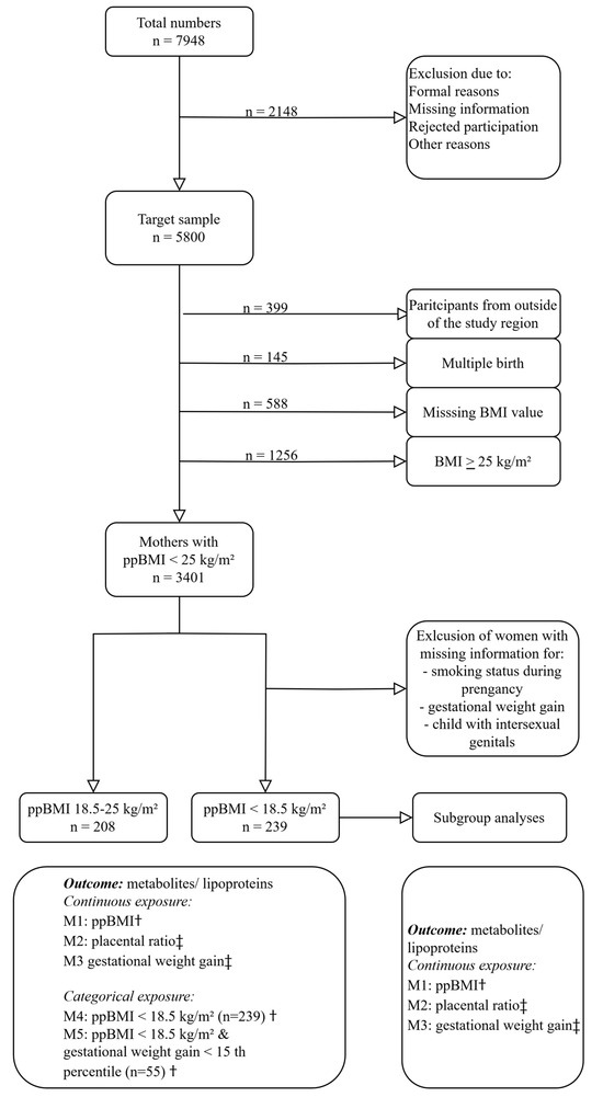 The data of 5800 mother–child dyads were included in the baseline of SNiP-I. For this analysis, only participants with a recorded ppBMI and singleton pregnancies with life birth were included. Mothers who were overweight or obese (n = 1256) were excluded. Moreover, 13.9% (n = 475) of the remaining participants (n = 3401) had a ppBMI of <18.5 kg/m2. In another step, the mother–child dyads with missing smoking status and gestational weight gain were also excluded. From the remaining participants, cord blood was analyzed in 53.5% (n = 239) of cases. A sample of healthy mother–child dyads with a normal ppBMI (n = 208, a ppBMI of 19–24.9 kg/m2) and cord blood samples served as controls. Figure 3 gives information on the how mother–child dyads were excluded for analysis, and how the study population was separated into different groups.