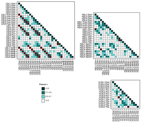 The continuous data were expressed as the median (Q1; Q3). The nominal data were displayed as total numbers and percentages. For the bivariate analyses, the Kruskal–Wallis test (continuous data) or χ2-test (nominal data) were performed. Before checking for associations, we performed Pearson correlation tests for the measured lipoprotein subclasses (Figure 4). Based on the correlations, some parameters were not considered further to minimize the statistical error rate. Linear regression models were used to assess the associations between the cord blood metabolites/lipoproteins (dependent variables) and the independent variables, including a ppBMI of <18.5 kg/m2, a continuous ppBMI, GWG, and the placental ratio (the placenta weight divided by birth weight). These were then adjusted for the maternal parameters of age, sex of child, smoking during pregnancy, gestational age, and neonatal parameters (birth weight and hypoglycemia), which were used to detect the associations between. Subgroup analyses using the same linear regression models were performed among the mother–child dyads with a maternal ppBMI of <18.5 kg/m2 and a GWG < 25th percentile. Furthermore, the analyses were repeated in the subgroup of women with a ppBMI of <18.5 kg/m2. A p-value below 0.05 was considered statistically significant. In the association studies, to account for multiple testing, we further adjusted the p-values from regression analyses by controlling the false discovery rate (FDR) at 5% using the Benjamini–Hochberg procedure. Statistical analyses were performed with SAS 9.4 (SAS Institute Inc., Cary, NC, USA).