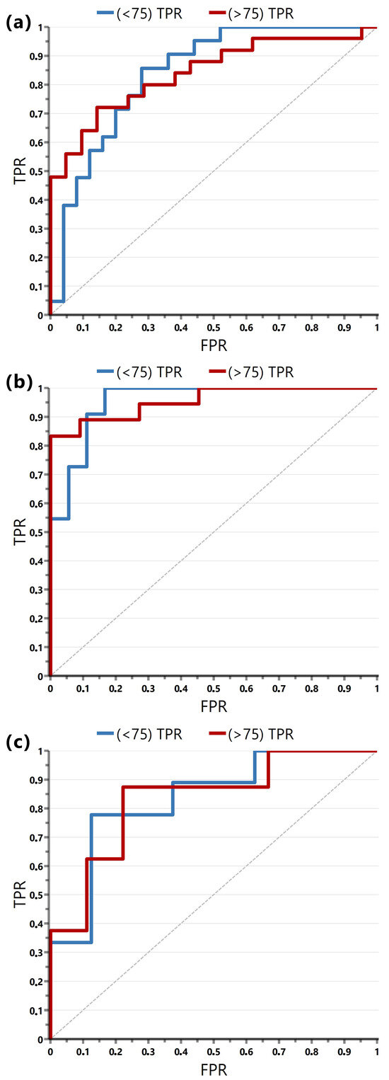 The ROC curves for the OPLS-DA models presented in Figure 2 and Table 2 show the true positive rate (TPR) against the false positive rate (FPR) for (a) the study group (the total area under the curve, AUC = 0.84), (b) the male group (AUC = 0.95), and (c) the female group (AUC = 0.83). The red and blue curves denote TPR for the responders (>75) and non-responders (<75), respectively. The TPR was calculated based on the OPLS-DA misclassification tables.