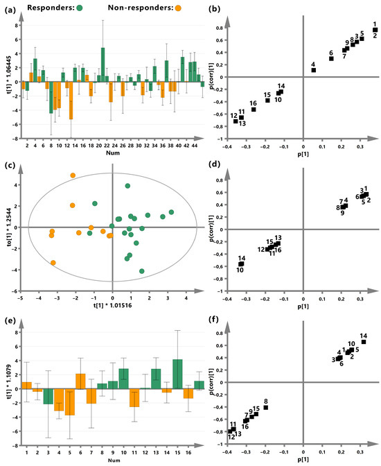 The results from the OPLS-DA analysis discriminating the iCHT responders from non-responders (the score plots: (a,c,e)) based on the pretreatment blood serum metabolites (the s-plots: (b,d,f)) for the study group (a,b), males (c,d), and females (e,f). The numbering of the metabolites on the s-plots corresponds with the numbering in Table 2: 1—isoleucine 0.95 ppm; 2—isoleucine 1.02 ppm; 3—alanine; 4—glycine; 5—tyrosine; 6—N-acetylcysteine; 7—lipids 0.9 ppm; 8—lipids 1.3 ppm; 9—lipids 5.3 ppm; 10—acetate; 11—glutamate; 12—3-hydroxybutyrate 4.21 ppm; 13—3-hydroxybutyrate 1.23 ppm; 14—formate; 15—acetone; 16—acetoacetate. The results take into account the resonance signals of the functional groups of a given metabolite at different chemical shifts, e.g., isoleucine at 0.95 and 1.02 ppm, lipids at 0.9, 1.3 and 5.3 ppm, as well as 3-hydroxyisobutyrate at 1.23 and 4.21 ppm.