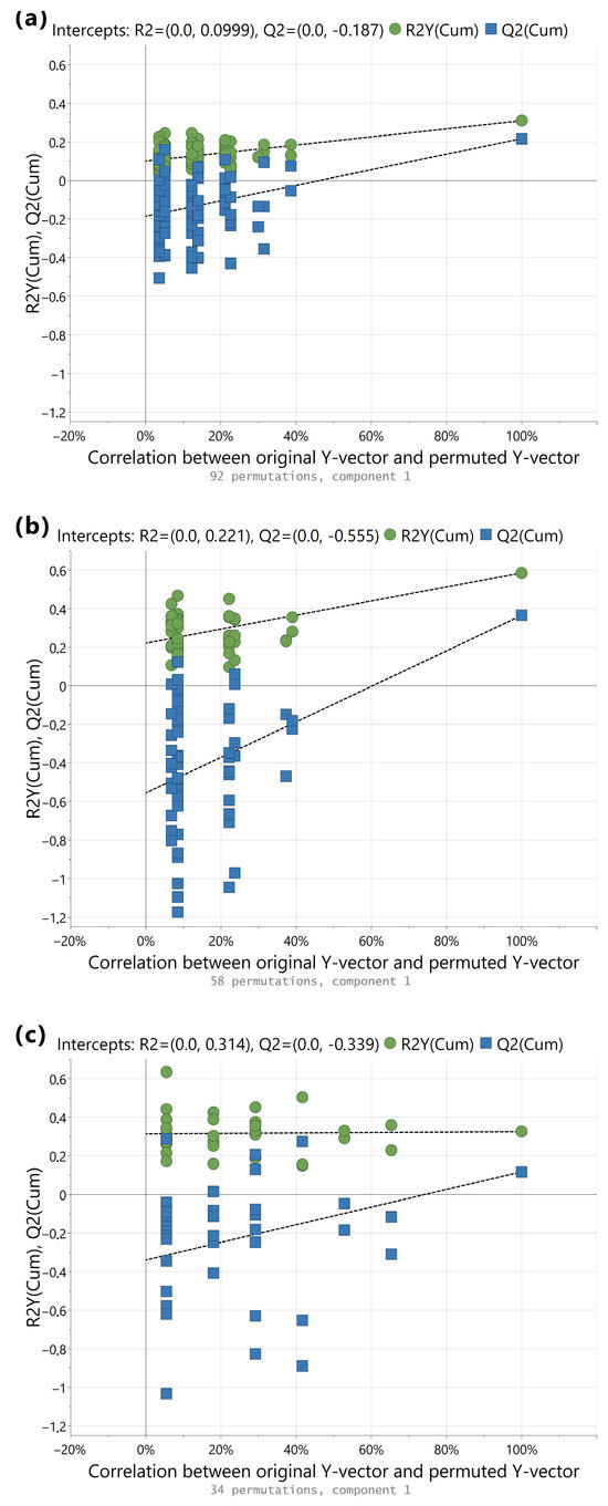 The results of permutation testing of the OPLS-DA models discriminating the responders from non-responders in the study group (a), males (b), and females (c). The number of permutations was set to twice the sample size.