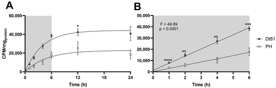Figure 2. Highly tumorigenic murine HCC cells exhibit increased uptake of exogenous glutamine. (A) 3H-glutamine (20 nM) uptake kinetics over 24 h in Dt81Hepa1-6 (Dt81) HCC cells and normal primary hepatocytes (PH). (B) Linear phase of 3H-glutamine uptake in Dt81 cells and PH (0–6 h). Linear regressions of 3H-glutamine uptake were compared by two-tailed ANCOVA. Intracellular quantities of 3H-glutamine were compared between Dt81 and PH at each timepoint. Experiments were performed a minimum of n = 4 times, each in duplicate. *: p < 0.05, **: p < 0.01, ***: p < 0.001, ****: p < 0.0001.
