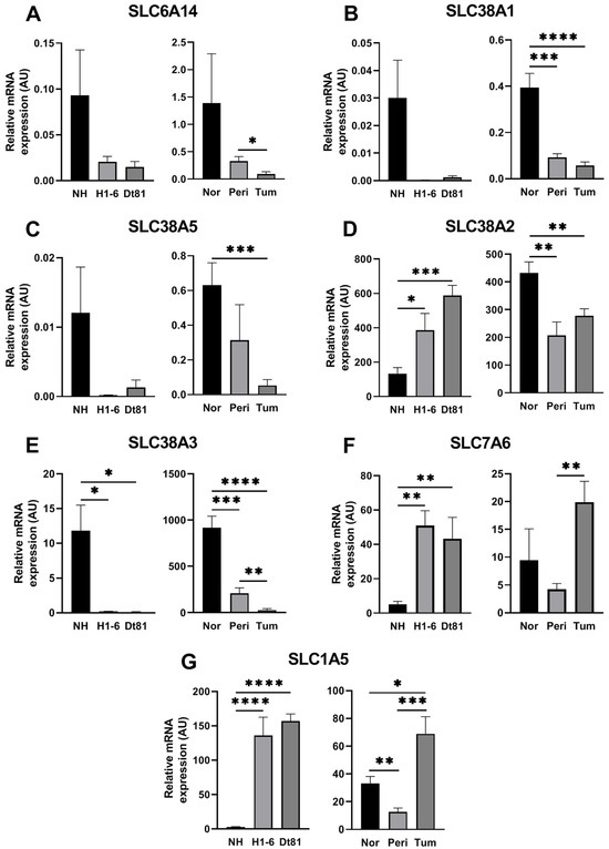 Figure 3. Murine HCC is characterized by the reprogramming of glutamine transporter mRNA levels. mRNA expression of glutamine transporters SLC6A14 (A), SLC38A1 (B), SLC38A5 (C), SLC38A2 (D), SLC38A3 (E), SLC7A6 (F), and SLC1A5 (G) relative to housekeeping genes (PPIA, HPRT1, and H2AFZ), measured using qPCR analyses. For cell cultures, mRNA was extracted after 24 h. NH: normal primary murine hepatocytes, H1-6: Hepa1-6 murine HCC cells, Dt81: Dt81Hepa1-6 murine HCC cells. Nor: normal mouse liver controls, Peri: peritumoral tissue, Tum: murine HCC tumor. AU: arbitrary units. *: p < 0.05, **: p < 0.01, ***: p < 0.001, ****: p < 0.0001.