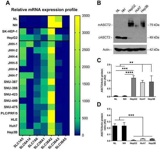 Figure 4. Glutamine transporter reprogramming in human HCC cells. (A) mRNA expression levels of the glutamine transporters SLC1A5, SLC6A14, SLC7A6, SLC38A1, SLC38A2, SLC38A3, and SLC38A5 relative to housekeeping genes (S9 and HMBS) in normal human liver tissue (NL), normal human hepatocyte isolates (NH), HepG2 and SK-HEP-1 non-HCC liver cancer cells, and a panel of 15 HCC cell lines, measured using qPCR analysis. (B) Representative Western blot image of ASCT2 protein expression in NL, NH, as well as HepG2, Huh7, and Hep3B cells after 24 h of cell culture. mASCT2: glycosylated surface membrane-bound ASCT2 (75 kDa), cASCT2: non-glycosylated cytosolic ASCT2 (49 kDa). (C) Quantification of mASCT2 (75 kDa) relative to actin. (D) Quantification of cASCT2 (49 kDa) relative to actin. AU: arbitrary units. **: p < 0.01, ***: p < 0.001, ****: p < 0.0001.
