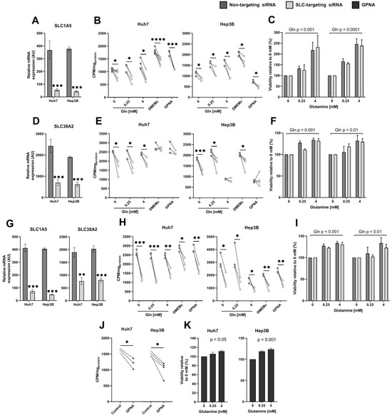 Given the residual uptake of glutamine under SLC1A5 and SLC38A2 inhibition, we measured the glutamine-dependent cell viability of Huh7 and Hep3B cells after RNA interference of SLC1A5 and/or SLC38A2 (Figure 6C,F,I), as well as after GPNA treatment (Figure 6K). As shown in Figure 6C,F,I, regardless of SLC1A5, SLC38A2, or their combined siRNA-mediated inhibition, Huh7 and Hep3B HCC cells maintained their capacity to utilize exogenous glutamine for the optimization of cell survival in a dose-dependent manner (Huh7: all p < 0.05; Hep3B: SLC1A5 siRNA: p < 0.001, SLC38A2 and combined siRNA: both p < 0.01). Furthermore, RNA interference did not negatively impact cell viability in any glutamine supplementation condition (Figure 6C,F,I), nor in DMEMc with or without combined GPNA treatment (Figure S1). Even under GPNA treatment, HCC cells were capable of using exogenous glutamine for cell survival (Huh7: p < 0.05; Hep3B: p < 0.001, Figure 6K).