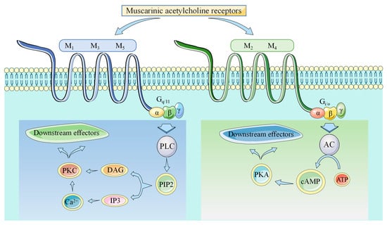 As first described by Loewi and Dale in 1921 [29], human mAChRs are classified into five subtypes (M1–M5), which are encoded by the genes CHRM1 to CHRM5 and differ by preference in G-protein coupling. Subtypes M1, M3, and M5 couple to G proteins of the Gq/11 family and activate phospholipase C, while subtypes M2 and M4 couple to Gi/o-type G proteins and inhibit adenylyl cyclase and modulate ion channel functions [1,30,31,32] (Figure 1).