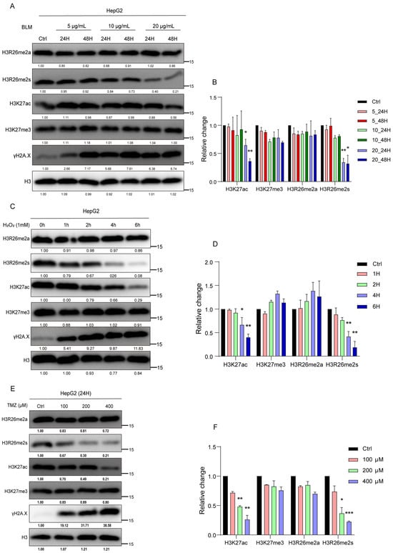 Histone modifications respond to the stress of chemical reagents in HepG2 cells. (A) HepG2 cells were treated with 5 μg/mL, 10 μg/mL, and 20 μg/mL bleomycin; for each BLM concentration group, cells were collected at 24 h and 48 h. Histone modifications were detected using immune blot with the indicated antibodies. (B) Relative changes in H3R26me2a, H3R26me2s, H3K27ac, and H3K27me3 in bleomycin-treated HepG2 cells (A). (C) HepG2 cells were treated with 1 mM H2O2 for 1, 2, 4, and 6 h, cell lysate was collected, and histone modifications were detected with the indicated antibodies. (D) Relative changes in H3R26me2a, H3R26me2s, H3K27ac, and H3K27me3 in H2O2-treated HepG2 cells (C). (E) HepG2 cells were treated with 100 μM, 200 μM, and 400 μM TMZ for 24 h, cell lysate was collected, and histone modifications were detected with the indicated antibodies. (F) Relative changes in H3R26me2a, H3R26me2s, H3K27ac, and H3K27me3 in TMZ-treated HepG2 cells (E). Data are shown as the mean ± SEM of two biological replicates and were analyzed with a two-tailed unpaired Student’s t-test. *: p < 0.05, **: p < 0.01, ***: p < 0.001.