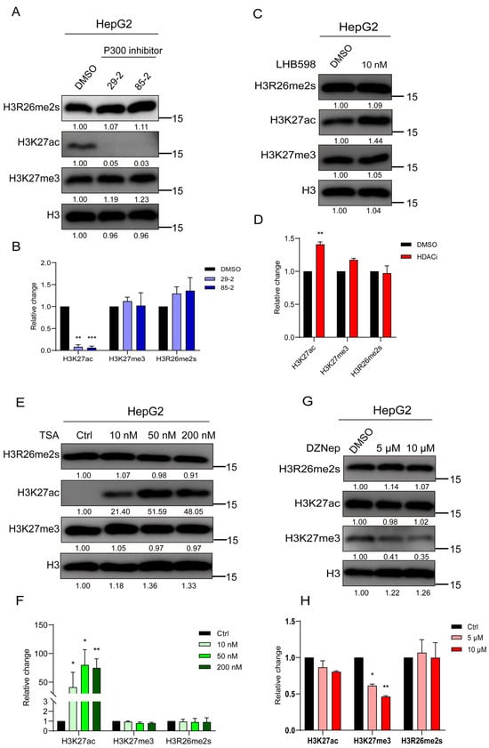 Our study revealed a decrease in H3R26me2s and H3K27ac levels during DNA damage, prompting an investigation into their interactive regulation. First, HepG2 cells were treated with a P300 inhibitor; as anticipated, the level of H3K27ac decreased, while the level of H3K27me3 remained unaffected, with no change in H3R26me2s levels (Figure 4A,B). Subsequently, HepG2 cells were treated with the HDAC inhibitors LHB598 or trichostatin A (TSA), leading to an increase in H3K27ac levels while H3R26me2s levels remained unchanged (Figure 4C–F). These results suggest that changes in H3K27ac do not induce changes in H3R26 symmetric methylation. A previous study introduced an H3R26A mutation in Drosophila melanogaster [], which significantly reduced the level of H3K27me3, indicating a relationship between H3R26 and H3K27me3. HepG2 cells were treated with the enhancer of zeste 2 polycomb repressive complex 2 (EZH2) inhibitor DZNep, to investigate whether H3K27 methylation affects H3R26 methylation. H3K27me3 levels decreased with DZNep treatment, but the reduction level was similar in both the 5 μM and 10 μM DZNep treatment groups. The level of H3R26me2s did not change in cells treated with DZNep, while H3K27ac levels increased slightly (Figure 4G,H). These results suggest that H3K27me3 demethylation does not impact the state of H3R26me2s.