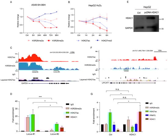 H3K27ac deacetylation mediated by HDAC1. (A) Normalized H3K27ac, H3K27me3, H3R26me2a, and H3R26me2s levels in bleomycin-treated A549 cells; A549 cells were treated with a single BLM concentration in a time-course manner, immune blot results are provided in Figure S1B. (B) Normalized H3K27ac, H3K27me3, H3R26me2a, and H3R26me2s levels in H2O2-treated HepG2 cells; HepG2 cells were treated with a single H2O2 concentration in a time-course manner, immune blot results are provided in Figure 2C. (C) Respective of the H3R26me2s and H3K27ac modifications landscape of the GAPDH genomic locus. (D) H3R26me2s, H3K27ac, and HDAC1 enrichment in GAPDH genomic locus. (E) Validation of HDAC1 overexpression in HepG2 cells. (F) Respective of the H3R26me2s and H3K27ac modifications landscape of the LPCAT1 genomic locus. (G) H3R26me2s, H3K27ac, PRMT5, and HDAC1 enrichment in LPCAT1 genomic locus with control or HDAC1 overexpression cells. Data information: Data are shown as the mean ± SEM of three biological replicates and were analyzed with two-tailed unpaired Student’s t-test. *: p < 0.05, ***: p < 0.001, n.s.: no significance. Layered H3K27ac indicates H3K27ac ChIP-seq peaks, each color represents one cell line, and data were downloaded from the UCSC Genome Browser.
