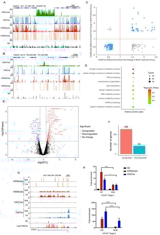 To investigate H3R26me2s and H3K27ac distribution features in the genome, HepG2 cells were treated with BLM to induce DNA damage. Histone modification information was acquired using CUT&Tag combined with next-generation sequencing [,,,].