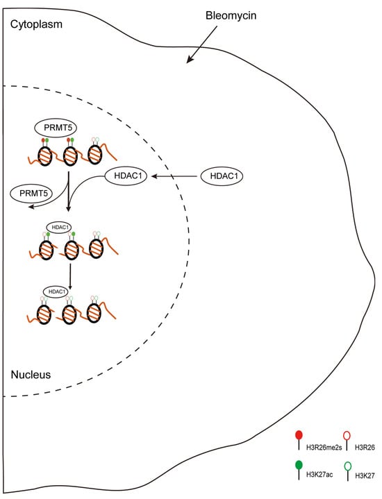 We analyzed changes in H3R26me2s and H3K27ac over time in HepG2 and A549 cells treated with BLM or H2O2. In A549 cells, H3R26me2s expression decreased earlier than that of H3K27ac (Figure S1B and Figure 6A). Similarly, in HepG2 cells, H3R26me2s showed an early decrease compared to H3K27ac (Figure 2C and Figure 6B). These results suggest that H3R26me2s demethylation occurs earlier than H3K27ac deacetylation.