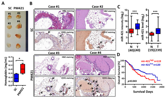 A total of 400 μL of growth factor-reduced Matrigel HC (#354262, Corning Inc., Corning, NY, USA), containing 15 U of heparin (#H3393, Sigma–Aldrich) and 100 μL of miR-421 mimics (PM421) or scramble control (SC), was injected into the right flank of 6-week-old male nude mice (BALB/cAmM.CgFoxn1nu/CrlNarl), 4 mice per group. The plug was removed after 12 days, and half of the plug was formalin-fixed and sliced for immunohistochemistry [49], while the other half of the plug was used for hemoglobin analysis. The presence of the blood endothelial cell-specific marker was assessed using a CD31 antibody (#3528, Cell signaling, Danvers, MA, USA). The hemoglobin concentration was measured using a hemoglobin kit (#EIAHGBC, Invitrogen, Carlsbad, CA, USA) following the manufacturer’s protocol as an indicator of the angiogenic index.