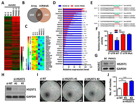 HS2ST1 is a target of miR-421 in HUVECs. (A) A heatmap of 371 differentially expressed genes was obtained in HUVECs transfected with miR-421 (PM421, 20 nM) compared to control cells (SC) with three biological replicates using Affymetrix microarrays (ClariomTM S Assay). (B) Venn diagram of 27 miR-421-targeted genes based on the intersection of Affymetrix microarray with miRWalk database. (C) Heatmap of 27 miR-421-targeted genes. (D) Validation of the expression level of 27 genes in miR-421-transfected HUVECs using quantitative real-time PCR. (E) Schematic representation of the putative miR-421 binding sequence in the 3′-UTR of HS2ST1 with wild-type form (HS2ST1 3′-UTR WT) and deleted form (HS2ST1 3′-UTR Mut). The matched nucleotides are labeled with green and red color. (F) The effect of miR-421 (PM421, 20 nM) on the luciferase activities of the constructs containing the wild-type or mutant-type 3′-UTR in HUVECs. (G) Western blot analysis of HS2ST1 in HUVECs following miR-421 (PM4421, 20 nM) or scramble control (SC) transfection for 48 h. GAPDH was used as an internal control. (H) Western blot analysis of HS2ST1 protein in HUVECs following transfection of si-HS2ST1 (si-HS2ST1 #1 and #2) or si-non-targeting control (si-NT) for 48 h. (I,J) Tube formation assay of HUVECs treated with the indicated transfection. Scale bar: 1 mm. Data are presented as mean ± SD; * p < 0.05; ** p < 0.01; *** p < 0.001.