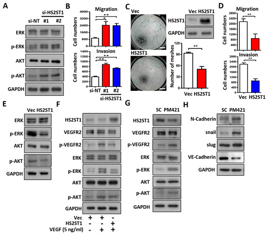 We next tested whether HS2ST1 could affect angiogenesis-related ERK and AKT signaling. The phosphorylation of ERK and AKT was increased in HS2ST1 knockdown HUVECs compared with control cells (si-NT) (Figure 4A). In addition, knockdown of HS2ST1 also resulted in enhanced migration and invasion abilities of HUVECs (Figure 4B). In contrast, HS2ST1 overexpression showed decreased migration, invasion, and tube formation (Figure 4C,D) in HUVECs. The phosphorylation of ERK and AKT was decreased in HS2ST1-overexpressing HUVECs compared with control cells (NT) (Figure 4E). These results suggested an important role of HS2ST1 in mediating angiogenesis-related signaling pathways. Previous studies have reported that 2-O-sulfated HS oligosaccharides by HS2ST1 can block basic fibroblast growth factor (FGF-2) binding to its receptor and modulate FGF-2-mediated MAPK signaling [14,31]. Given these findings, we hypothesized that HS2ST1 may be involved in the VEGF-induced ERK and AKT activation in HUVECs. To test this hypothesis, we examined the phosphorylation level of VEGFR2, ERK, and AKT in the presence of VEGF (5 ng/mL). As expected, HS2ST1 overexpression potently suppressed the VEGF-induced phosphorylation of VEGFR2, ERK, and AKT in HUVECs (Figure 4F). We then asked whether miR-421 could regulate the activities of VEGFR2, ERK, and AKT. We observed that miR-421 (PM421) overexpression not only decreased the expression of HS2ST1 but also increased the phosphorylation levels of VEGFR2, ERK, and AKT (Figure 4G). In addition, we also found that overexpression of miR-421 increased the expression of mesenchymal markers, such as N-cadherin, snail, and slug and, conversely, decreased the expression of epithelial markers, such as VE-cadherin (Figure 4H). Overall, these data demonstrated that the miR-421/HS2ST1 axis modulates the VEGF/VEGFR2-mediated activation of ERK and AKT, indicating a shifting trend for the EMT phenotype.