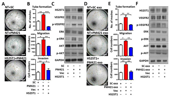Thus far, we have demonstrated that HS2ST1 is the direct target of miR-421, but whether miR-421 induces tube formation through HS2ST1 remains unclear. To determine whether miR-421-induced tube formation is mediated by HS2ST1, we co-transfected HUVECs with the miR-421 mimic (PM421) and an HS2ST1 expression plasmid that did not contain the 3′-UTR of HS2ST1. We observed that miR-421-induced HUVEC migration, invasion, tube formation, and phosphorylation of VEGFR2, ERK, and AKT were inhibited by HS2ST1 overexpression (Figure 5A–C). We repeated the above experiments by replacing miR-421 with miR-421-enriched exosomes isolated from OEC-M1 cells. Consistent with the above observation, HS2ST1 overexpression also suppressed the exosomal–miR-421-induced HUVEC migration, invasion, tube formation, and phosphorylation of VEGFR2, ERK, and AKT (Figure 5D–F). These results indicated that exosomal miR-421 promotes HUVEC tube formation and modulates angiogenetic signaling, mainly through HS2ST1 downregulation.