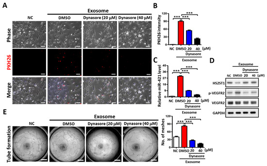 To identify the tube formation process that contributes to exosome internalization, HUVECs were treated with OSCC cell-derived exosomes and dynasore, an inhibitor of exosome internalization [33]. We found that the red fluorescence was decreased in HUVECs, depending on the dynasore concentration (Figure 7A). Dynasore significantly blocked 50% of exosome uptake (20 μM) and 91% of exosome uptake (40 μM) compared with that in DMSO control HUVECs (Figure 7B). Dynasore not only inhibited exosome uptake but also decreased miR-421 levels in endothelial cells (Figure 7C), which, in turn, increased HS2ST1 protein expression, decreased VEGFR2 phosphorylation (Figure 7D), and ultimately suppressed tube formation in HUVECs (Figure 7E). These results suggest that exosomes released by OSCC cells can act as angiogenesis promoters, and inhibiting exosome uptake by HUVECs may be a potential therapeutic approach for cancer treatment.