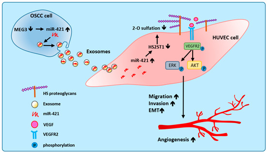 Proposed model illustrating that exosomal miR-421 modulates angiogenesis in OSCC. Downregulated lncRNA MEG3 increases the amount of miR-421, which is then packaged in OSCC-derived exosomes and secreted into the tumor microenvironment. MiR-421-enriched exosomes are taken up by HUVECs to induce angiogenesis through targeting HS2ST1. Downregulation of HS2ST1 leads to decreased 2-O-sulfation of HSPG, thereby facilitating VEGF binding to VEGFR2, which then promotes the EMT, migration, invasion, and angiogenic potential of HUVECs.