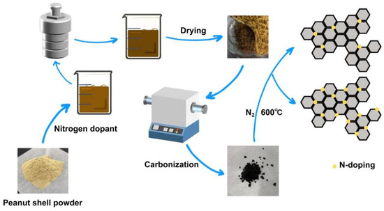 The electrochemical performance of biomass-activated carbons as electrode materials for supercapacitors depends mainly on their specific surface area, pore size distribution, and functional groups [26]. Therefore, to obtain highly available biomass-derived carbons in supercapacitor applications, it is necessary to develop porous carbons with rich functional groups and more reasonable pore structures. In general, it is believed that doping the activated carbon skeleton with heteroatoms can effectively modulate the electronic properties of carbon materials and enhance the hydrophilicity and electrical conductivity of carbon materials [27]. In addition, heteroatoms can create pseudo-capacitance by reacting with functional groups on the surface of the carbon material, thereby improving the electrical conductivity and wettability of the carbon material, and the overall electrochemical properties can be improved [28]. Among the various non-metallic elements that can be doped into carbon materials, those containing N are particularly useful. This is because the radii of N and C atoms are almost identical, which allows the N atoms to be incorporated into the carbon structure with ease [29]. N-type doping sites, which exhibit electron-donating behaviors, are typically created by N atoms. These sites play a crucial role in enhancing the electronic conductivity by increasing the electron density within the π-π conjugation of the carbon matrix, optimizing the surface wettability, facilitating charge transfer by charge modulation, and ultimately leading to an increase in the power and energy density [30]. The capacitance of nitrogen-doped carbons (NPCs) can be attributed to two sources: the EDLC effect and the faradaic reaction occurring on or close to the surface of the carbon material [31]. Song et al. [32] prepared a corncob-based porous carbon by KOH activation and carbonization, followed by N doping employing urea. The specific capacitance of the optimized sample reached 382.6 F/g at 0.5 A/g and still maintained 232.7 F/g at a high current density of 20 A/g. Wang et al. [33] used grapes, KOH, and NH4Cl as biomass sources, activators, and nitrogen sources. The optimized sample NGHPC exhibited a unique honeycomb-like structure and a high specific surface area of 1268 m2/g. As a supercapacitor electrode, the NGPHC electrode exhibited a remarkable specific capacitance of 275 F/g at 0.5 A/g in a three-electrode cell. Zhang et al. [34] obtained nitrogen-doped porous carbon materials by the one-pot co-pyrolysis of a carbon precursor (wheat straw), nitrogen precursor (melamine), and salt templating. The optimized sample with 7.78% nitrogen content exhibited an excellent gravimetric capacitance of 223.9 F/g and maintained 91.4% capacitance after 10,000 cycles. In general, the preparation of NPCs is typically achieved through the pyrolysis of biomass waste containing nitrogen elements, followed by the post-treatment of carbon materials with nitrogen dopants at high temperatures [35]. Therefore, we hypothesized that the pyrolysis of peanut shells with different nitrogen resources would result in different active sites for carbon-based electrodes, which could further influence the electrochemical performance of SCs.